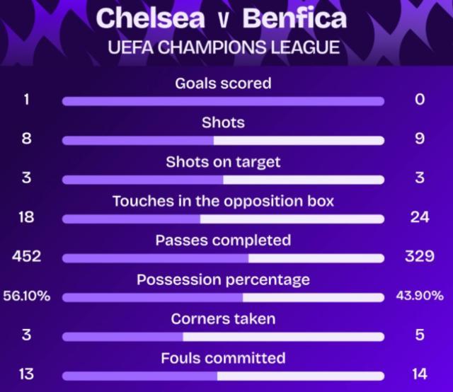 欧冠联赛阶段第二轮迎来一场话题度之战:切尔西主场迎战穆里尼奥执教的本菲卡。第18分钟,加纳乔制造理查德·里奥斯的乌龙。比赛最后时刻,若昂·佩德罗两黄变一红被罚出场。最终切尔西主场1比0小胜本菲卡。