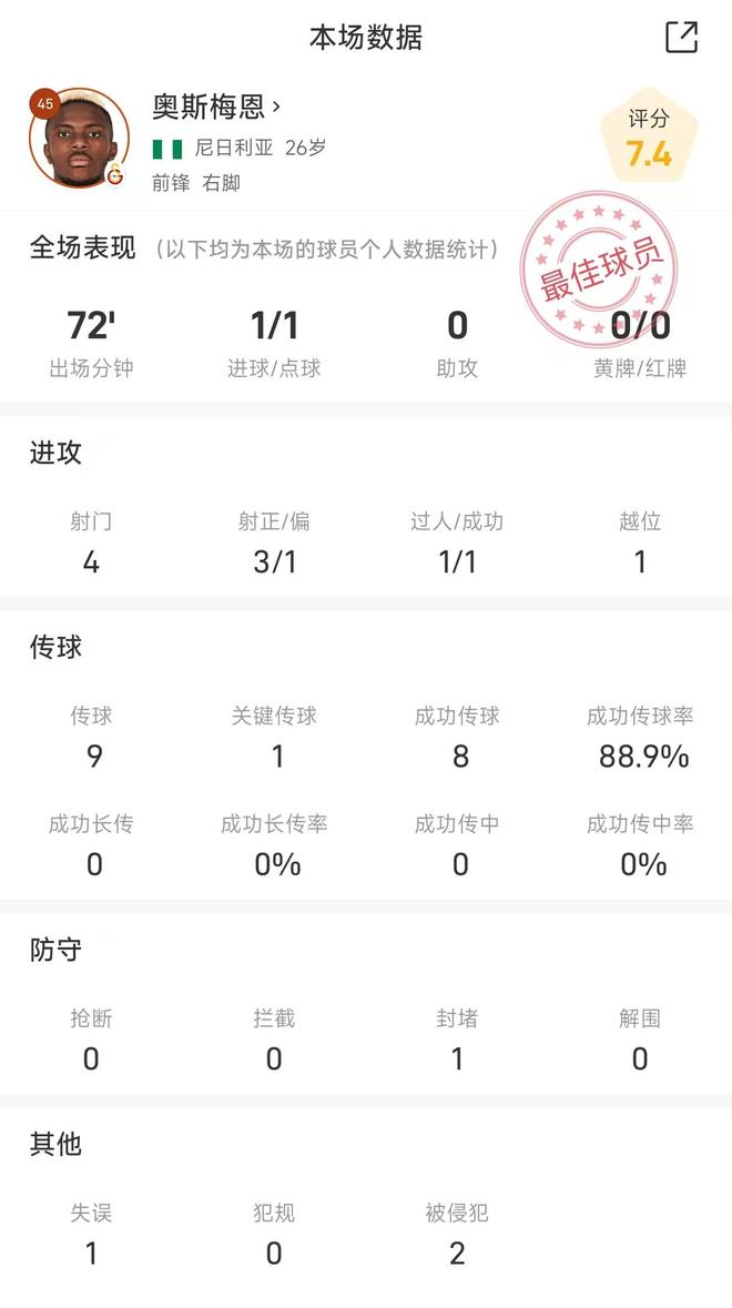 雷速体育10月1日讯 在今天凌晨结束的加拉塔萨雷1-0利物浦的欧冠比赛中,奥斯梅恩点射建功帮助球队力克红军,并当选全场最佳球员。