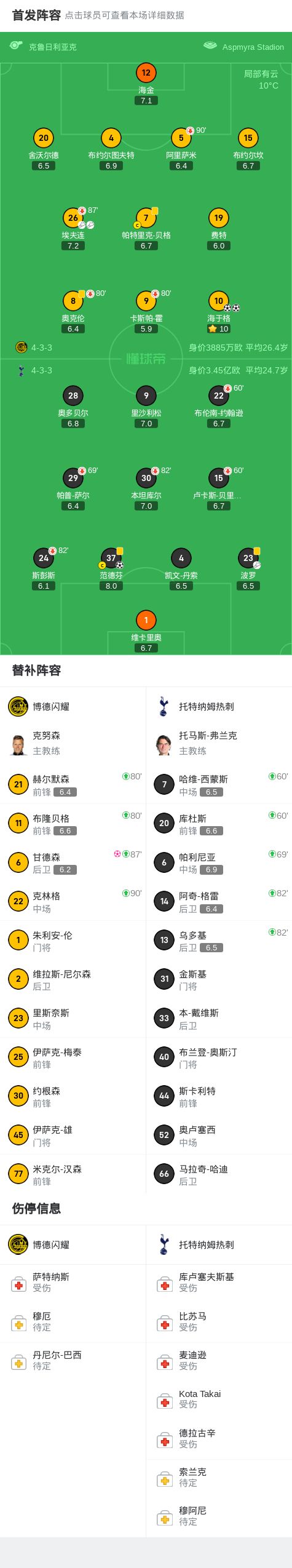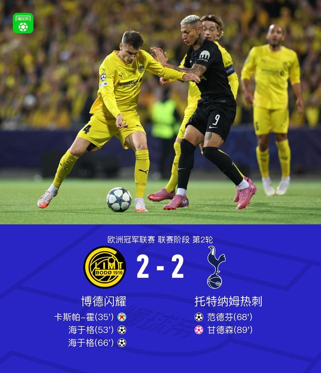北京时间10月1日欧洲冠军联赛第2轮,博德闪耀对阵托特纳姆热刺。上半场,卡斯帕-霍主罚点球打飞。下半场,海于格双响,范德芬头槌扳回一城,比赛尾声阶段,甘德森门前自摆乌龙。最终比分博德闪耀 2-2 热刺。